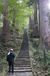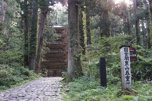 最終日は、出羽三山神社のある羽黒山へ。神社としては日本一の2446段の石段詣だ。すぐに国宝の五重塔に出合う。そして、その先から石段が始まる。各々が300段以上ある一の坂、二の坂、そして三の坂をこなし1時間強で三神合祭殿に到着。クルマでもすぐ近くまで来られるのだが、ご利益がどうかと思われ階段ルートを選んだ。およそ600本の杉並木に包まれた古色蒼然たる石段はなかなかの雰囲気。月山登山の翌日なので堪える登りだったが、心洗われたかのよう。