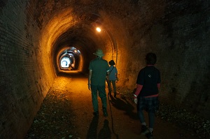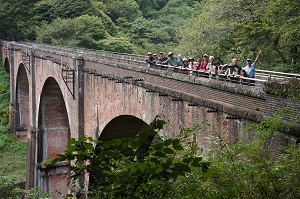 バスを貸切り、千葉県から長野県へ。外環が予想以上に混雑をしていてスケジュールが遅れ気味に。メインイベントの「日本で一番海岸線から遠い地点」訪問は翌日に変更し、碓氷峠のめがね橋(碓氷第三橋梁)を訪れその上の元軌道敷である遊歩道アプトの道を横川の駅までハイキング。トンネルが続く雰囲気のある遊歩道。途中、頭上の架線構築物の上に2匹の猿がまるで置き物のように鎮座していてビックリしたり、めがね橋と同じく重要文化財となっている旧丸山変電所を眺めたり・・・緩い下りでもあり快適なウォーキングとなった。