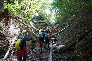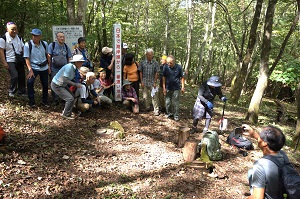 早朝の小雨はあがり、佐久市の「日本で海岸線から一番遠い地点」へと。臼田駅から山の中へと進み雨川砂防ダム近くの標高920mの駐車場に到着。関係車両以外通行止めのゲートを抜けて林道跡を進みます。ルートは距離2.3km、コースタイム80分なれど、後半1kmほどは沢筋の荒れた道だとか?!緩い勾配の林道跡はスムースにこなし、いよいよ問題の沢筋に突入する。台風の影響か倒木が想像以上に多くルートを探すのにちょっと一苦労。水量はほとんどチョロチョロなので問題無し。倒木を潜ったり乗り越えたりしつつ「あと650m」から「あと100m」をこなし、地点近くのトリカブトの群生に迎えられる。少し平地を進むと「日本で海岸線から一番遠い地点」の標柱がある。標高1200mへの時間はちょっとかかったが脱落者無し!周りの眺望などは望めないが何か独特の達成感がある。お昼を楽しみ駐車場に戻る。佐久市臼田支所に寄り、地点での証拠写真を提示して全員が認定証をいただく。事前に名前を登録してあったのでスムースに発行してもらえた。