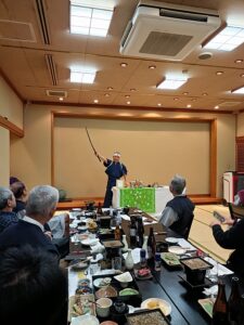 1日目は開会のあいさつに始まり、各支部の活動報告などの後、茨城支部会員によるインド・ヒマラヤのカンヤツェⅡ峰の登頂報告と常陸国ロングトレイルについての講演がありました。夜は、恒例の懇親会がありました。宴会では、同じく茨城支部会員による筑波山「ガマの油売り」の実演もあり、大変盛り上がりました。