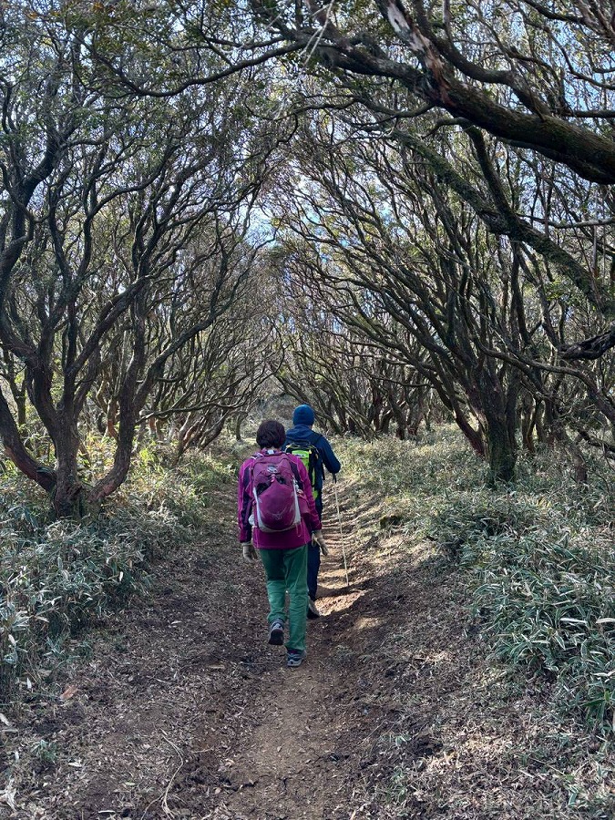 翌日は、だるま山高原レストハウス駐車場から伊豆山稜線歩道へ。戸田峠を経て、小達磨山、長い階段を登って達磨山。古希山の先の伽藍山まで歩く。帰りは富士山を眺めながら同じ道を戻る。帰りに寄った金冠山も素晴らしい富士の眺め。風は冷たいが、南アルプスも見えて笹原の気持ち良いコースを楽しんだ。(三)
