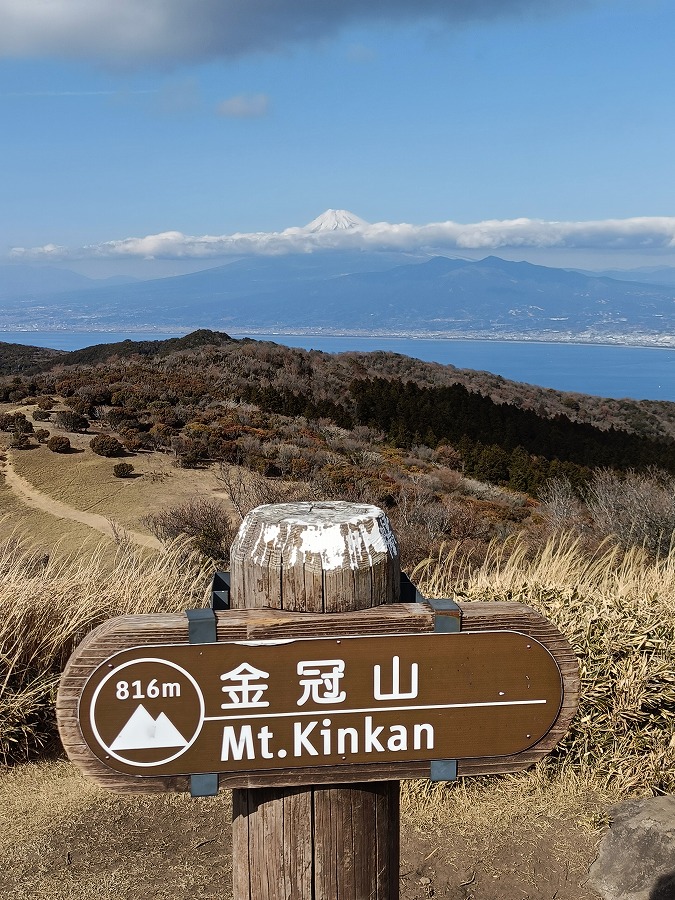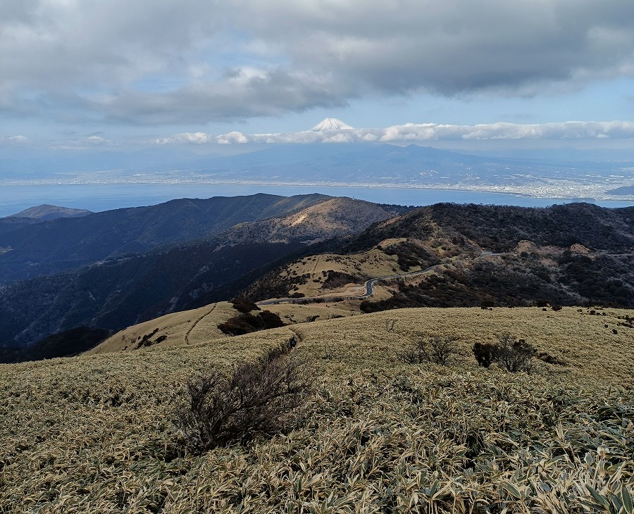 東名高速と伊豆縦貫自動車道を乗り継いで大仁IC下車。林道を走り葛城山登山口に駐車、まずは発端丈山を目指す。歩き始めは急だったが、すぐに歩きやすい登山道になる。1時間弱で発端丈山の山頂。富士山が目の前に広がる。寒いので写真など撮り、引き返す。戻る途中の分岐から次の葛城山へ。急登を登るとフェンスがある。葛城山の山頂に行くには有料エリアの入園料2500円が必要なので、フェンス伝いに回り込む。日当たりの良い芝生で休憩したら、破線コースで下山する。これが結構急な斜面で木をつかみながらようやく降りた。駐車場所までいったん戻り、次は城山へ。30分ほどで修善寺の街を見下ろす城山の山頂に到着。気持ちのいい低山歩きを楽しんだ。