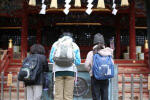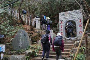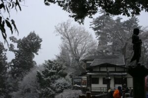 山頂へ歩き出し。タコ杉を眺め、煩悩と同じ108段の階段、ついで男坂の急で長い階段を登る。子どもたちは雪が降っていても元気だ、どんどん進んでいく。