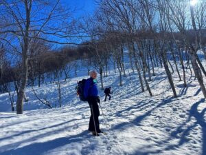 阿寺山は八海山と尾根続きの山で、冬に人気の山らしい。しかし累積標高は1,100mを超え、急登続きでなかなか手強い山だった。除雪最終地点で駐車、キャパは10台ぐらいまでだろうか。平日なのにラスト1台に停められた。