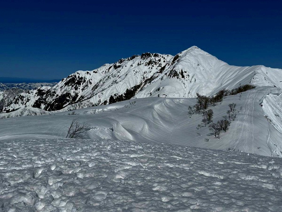 歩き始めはしばらく平坦な雪道。取り付きからはひたすら急登。ツボ足で登るが、雪が柔らかく気を付けないとズルズル滑る。登っても登ってもなかなか山頂が見えてこない。4時間掛かり、ようやく広い山頂へ着くと素晴らしい景色が待ってました。八海山、越後駒、中ノ岳の越後三山。巻機山には滝雲がくっきりと見えました。