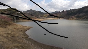 干上がった佐久間ダム。向こうに頼朝桜、スイセン、梅が咲いていた
