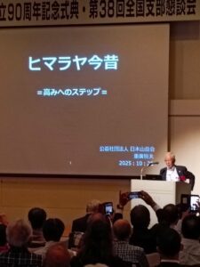記念式典は、主催した水谷関西支部長の挨拶で始まり、橋本会長の祝辞、大阪府山岳連盟会長の来賓の祝辞と続きました。その後、重廣恒夫さんの「ヒマラヤ今昔」と題した記念講演がありました。1970年代のエベレスト遠征から現在のグレートヒマラヤトラバースに繋がる壮大なヒマラヤ登山と自分史を振り返る、非常に興味深い話でした。夕方からは、恒例の大懇親会があり参加者は親交を温めました。