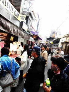 カレッタ汐留46Fから浜離宮恩賜公園と高層ビル街を展望後は、昼食予定地の「築地場外市場」に向かってビル街をしばらく歩行して、築地場外市場に到着した。混雑は予想していたが、鮮魚食が陳列する店舗前の道路は外国人が極めて多く予想以上に混雑していた。人々が道路いっぱいに溢れて、なかなか進むことができずに好みの店舗探しに労を費やした。この混雑のなかで、落ち着いて昼食を摂るのは難しく場外市場を避けて昼食するウォーク仲間もいた。