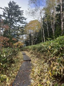 尾瀬口からはまたバスに乗り、御池経由で沼山峠へ。高校生の頃(半世紀以上昔)は尾瀬口の船着き場から歩いて尾瀬や平ヶ岳を目指したことを思い出しながらバスに揺られる。標高が高まるにつれて、木々の色づきが始まっていることに気づく。ナナカマドの赤やダケカンバの黄色がピンポイントに色づいて、秋の訪れを感じさせてくれる。