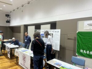 日本山岳会群馬支部では相談ブースと背面に木暮理太郎の資料展示を行い、古道や山岳祭のリーフレットや入会案内のしおりなどを配布した。また会員がトークイベントの安全登山や登山道整備のスピーカーとして登壇した。