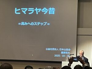 14時30分から始まった記念式典は、水谷透関西支部長の主催者あいさつに始まり、橋本しおり日本山岳会会長のあいさつ、そして大阪府山岳連盟の小畑和人会長による来賓祝辞と続いた。日本山岳会元副会長で日本ヒマラヤ登山の第一人者、重廣恒夫氏による記念講演「ヒマラヤ今昔」は、『処女峰アンナプルナ』で登山に目覚めた少年時代から始まった自身の登山人生をヒマラヤ登山史に重ね、日本山岳会120周年記念事業の「グレートヒマラヤトラバース・プロジェクト」で結ぶ重厚なストーリー。