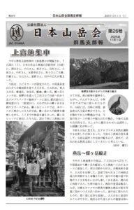 群馬支部報第26号 群馬支部報第26号を発行しました 7月の上高地集中合宿の記録とナルミズ沢、早池峰山、立山三山縦走、東北・北海道地区集会、高頭祭など初夏から夏までの主な山行報告、行事を中心に構成しました。 ダウンロードはこちらから(PDF 1.6MB)。