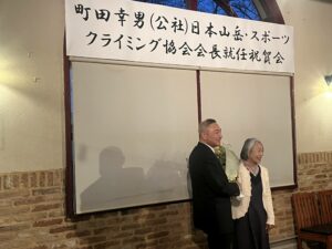 祝賀会発起人で同協会・群馬岳連の八木原圀明顧問は、登山界の変化と課題の中で町田新会長への期待と祝意を述べ、それに対し町田会長は「登山界は今、まさしく過渡期にある。先人が築き上げた山の文化を大切にし、安全登山の啓発とスポーツクライミングの発展に尽くしていく」と覚悟を語った。