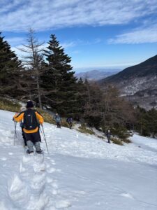 登りは雪も締まっていて、スノーシューも要らないかと思うほどに歩きやすかったが、今年は積雪がかなり少なく、部分的な地肌やヤブも気になった。そんなわれわれを横目にアイゼンで軽やかに夏道を登ってきた登山者もいて、少し恨めしい気分。