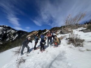 下山は雪が緩み、急斜面のスノーシューさばきにはちょっと苦労したが、それでもキャッキャと子どものように嬉々として雪に遊ぶ。天気の心配のない、こういう日は時間の許す限りのんびりゆったり山と遊ぶのが一番。午後4時の下り雪上車まで楽しい仲間たちとの和気あいあいとした山の時間を楽しみ、雪山天国を満喫した(根)。