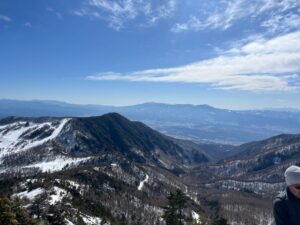 山頂からは四阿、妙高、後立山、穂高、乗鞍、御嶽、中央、八ヶ岳、南、富士山、奥秩父、西上州、高峰・黒斑。そして北を見れば、眼下には雪をまとわぬ嬬恋の大地を前景に、遠く日光白根、尾瀬、谷川、三国、そして草津白根・四 阿・・・。日本百名山がいくつあっただろうか。