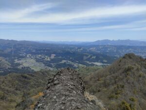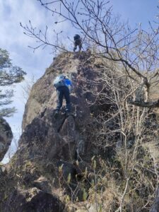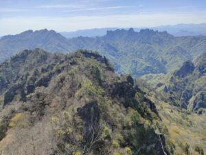 ミョウギイワザクラを愛でに裏妙義山へ 久しぶりの龍駒山・産泰山・御岳・丁須の頭を巡る御岳周回コースです. 御岳稜線まで一気に登りきると 妙義山独特の世界が新緑と相まってなんとも言えません. このコースは鎖場だらけで 全身を使いながら進む楽しいアドベンチャーコース! お目当ての妙義山の固有種 危険な岩場にしか咲かない正に高嶺の花「ミョウギイワザクラ」にも 最高のタイミングで会えて大満足! また、丁須の頭から望む360°のパノラマは格別でした. ヤマビル対策もバッチリで今回はやられずに済みよかったです. 大満足の山行となりました. (報告・田中)