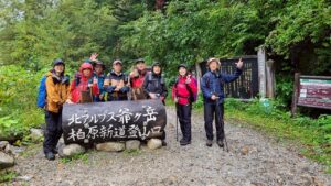 2日目も、一日中雨でした。しかし皆さんで頑張り、予定より1時間早い15時に柏原新道登山口に到着することができました。登山道入り口で最後に記念写真を撮って解散しました。