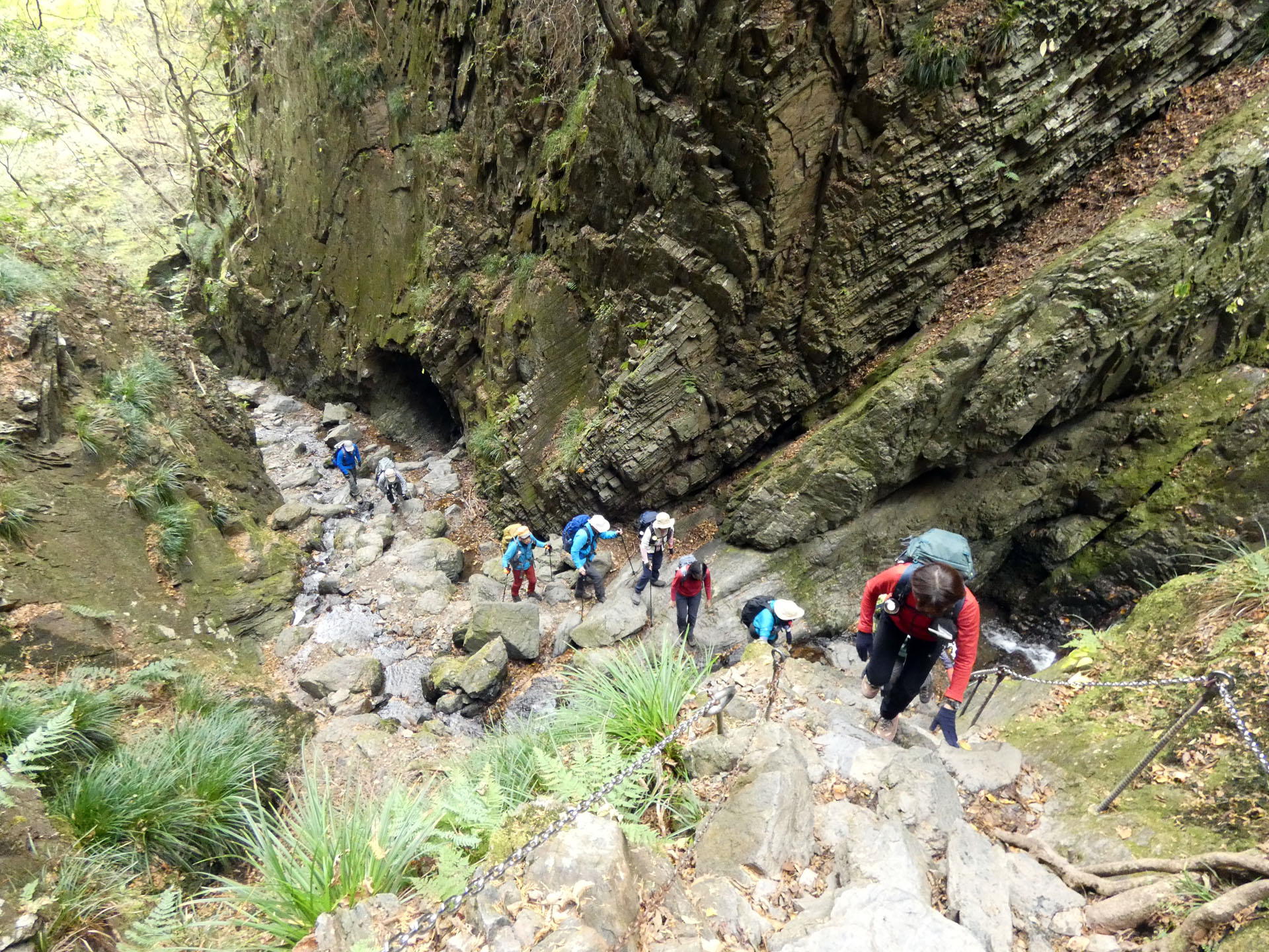 程なくして、白谷沢登山口に到着。衣服調整、水分摂取後杉林の樹林帯へと進む。寒さはさほどではなく、歩くのには絶好の気候である。30分ほどでゴルジュに到着。水に濡れた石の上を慎重に渡り、鎖場も問題なく通過。その後林道を横切るところで小休止。女性参加者が多く、また久しぶりの参加者も居たため、会話が途切れる事なく終始にぎやかな雰囲気であった。