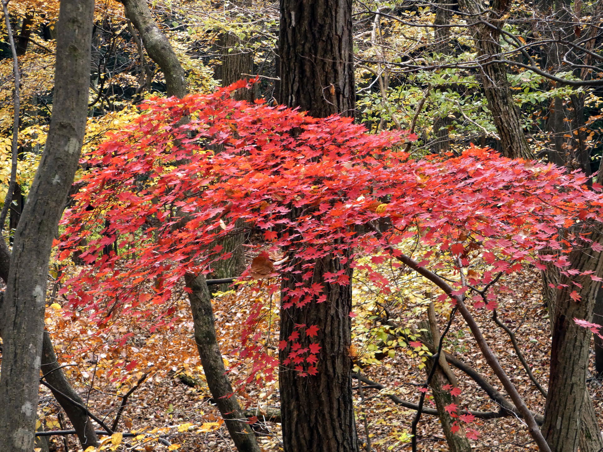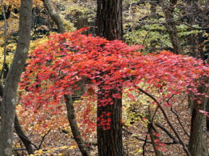 日没が早くなる時期であり、暗くなる前に樹林帯を抜けられるか不安であったが、14時過ぎには林道に出ることができ、そこから川井駅に向かい予定より早く到着することが出来た。秋晴れの中、紅葉も見頃で気持ちよく歩けた一日であった。
